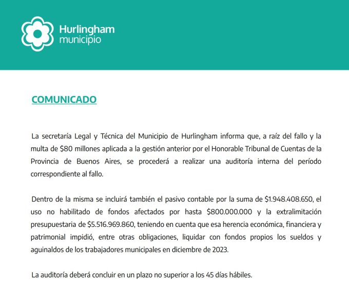 Uno de los puntos más críticos del fallo es el ocultamiento del déficit financiero con el que fue entregada la gestión, que asciende a 1400 millones. La magnitud de los hallazgos motivó al gobierno actual a anunciar una auditoría integral sobre el período señalado (2023). La revisión tendrá un plazo de 45 días. “Hurlingham ya dejó atrás esta manera de administrar los recursos que son de todos”, expresó la jefa de gabinete Florencia Lampreabe.
